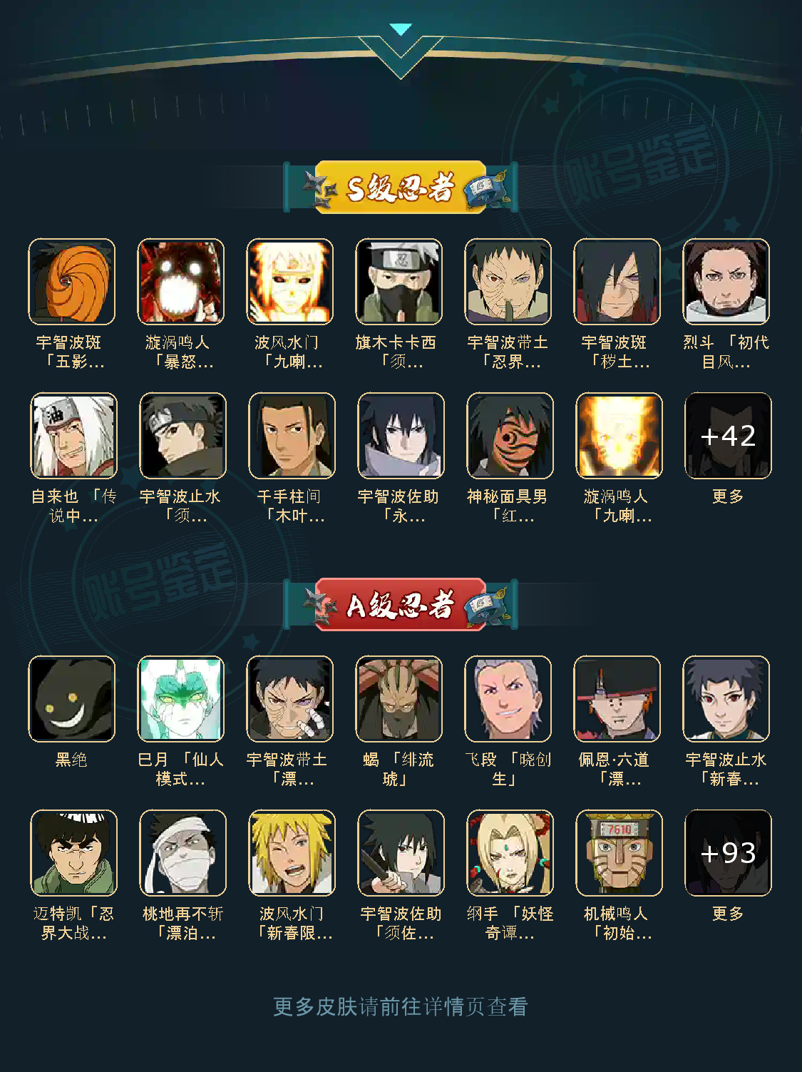 仙人自来也 纲手 波风水门 百战水门 猿飞日斩 千手柱间 宇智波斑 宇智波鼬 舞之自来也 大蛇丸 百战大蛇 秽土四代 秽土三代 秽土长门 仙人兜 黄猿九喇嘛鸣人 紫狗永恒佐助 樱婊忍战樱 秽土鼬 普通自来也 百豪纲手 死门凯 二代扉间 秽土二代 秽土初代 秽土柱间 白面具 须佐卡卡西 小胡子鬼灯幻月 雷影 土影 无 佩恩 百战佩恩 青年柱间 创立初代 秽土斑 青年斑 解斑 须佐止水 虎皮 破面带土 红夜带土 罗砂 秽土三代风影 忍战雷影 三代雷影 金角银角 秽土半藏 忍战大野木 小土豆 天道超 大筒木桃式 大筒木金式 钢铁之躯凯 桀骜之刃阿斯玛 狂野之鲨鬼鲛 飞段 黑飞段 百豪樱 忍战李 大卡卡西 五代水影照美冥 宇智波鼬 仙鸣 九尾查克拉鸣人 鹰佐 奇拉比 青年艾 半蛇兜 晓蛇 新春鼬 面麻 须佐佐助 疾风咒印佐助 忍战宁次 忍战天天 最终章雏田 幻容卡卡西 神卡 忍战卡卡西 泳装卡卡西 忍战凯 青春哥 惊门凯 爱情哥 新春止水 新春水门 青年水门 青水 新春我爱罗 泳装照美冥 侠隐照美冥 侠隐纲手 侠隐兜 漂泊再不斩 漂泊佩恩 漂泊二代 漂泊小南 漂泊佩恩 三船 青年三船 青年长门 泳装南 新春南 黑绝 新春大蛇丸 晓创生角度 晓创生蝎 晓创生飞段 泳装鼬 鲛肌融合鬼鲛 新春迪达拉 秽土迪达拉 恶灵之影飞段 暴怒带土 忍战黄土 卑留呼 桃博 黑土