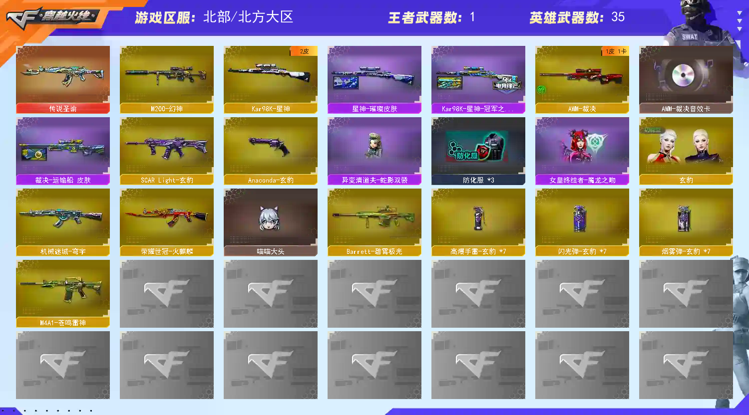【亮点解析 裁决三件套 】【m200幻神】【98k星神+冠军之星 +璀璨 】【传说圣谕】【scar玄豹】【裁决+卡+运输船 】【玄豹套】【武器: 机械迷城 荣耀世冠火麒麟 】【手枪:玄豹 】【5刀具:屠龙 玄豹*2 王者冰锋 荣耀世冠龙啸 】【雷套:玄豹雷*7 】【音效卡:裁决音效卡 】【四防角色:玄豹】