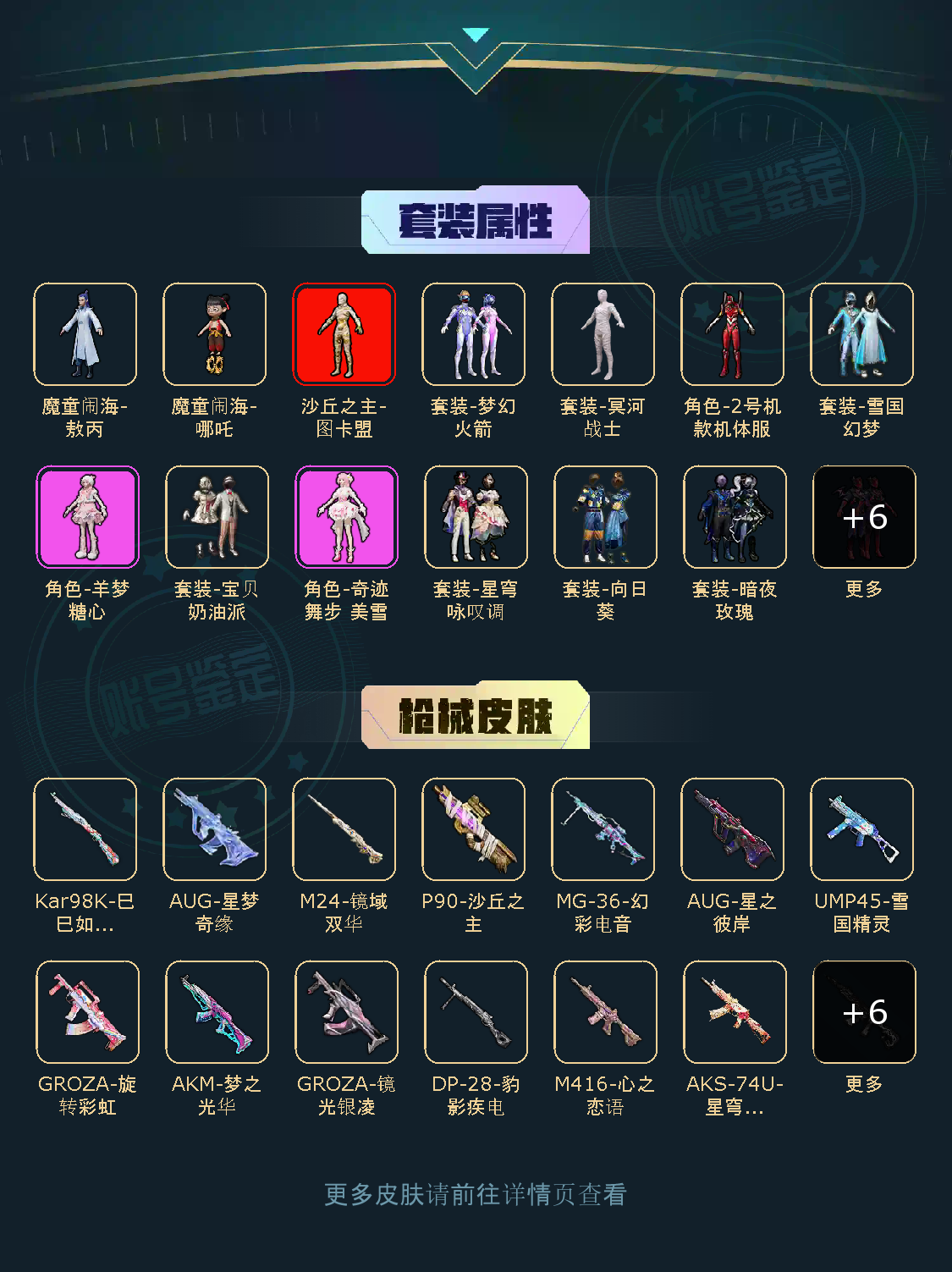 【稀有资产】沙丘之主-图卡盟[4级]/角色-魔童闹海-敖丙[2级]/角色-魔童闹海-哪吒[1级]/角色-2号机款机体服/套装-雪国幻梦/角色-千金淑猫/角色-羊梦糖心/M416-心之恋语/AUG-星之彼岸/AKM-梦之光华/AUG-星梦奇缘/M416-墨龙九天/SCAR-L-魔童闹海 哪吒/角色-零款战斗服/角色-真嗣款战斗服/熔岩游骑兵面罩/小恶魔头饰/木乃伊套装/套装-奇异狩猎者/套装-暗夜魅影/套装-粉红小猪/套装-浪漫天命/套装-雪山精英/套装-暗影哥特/套装-龟仙人/套装-晶辉守护/套装-绒宝小鹅/套装-净心行者/套装-狂沙舞者/套装-东方飞龙/角色-粉雾星云/角色-摩登魅猫/角色-许七安/角色-俏兔智灵/角色-海琴烟/信号枪-彩虹独角兽