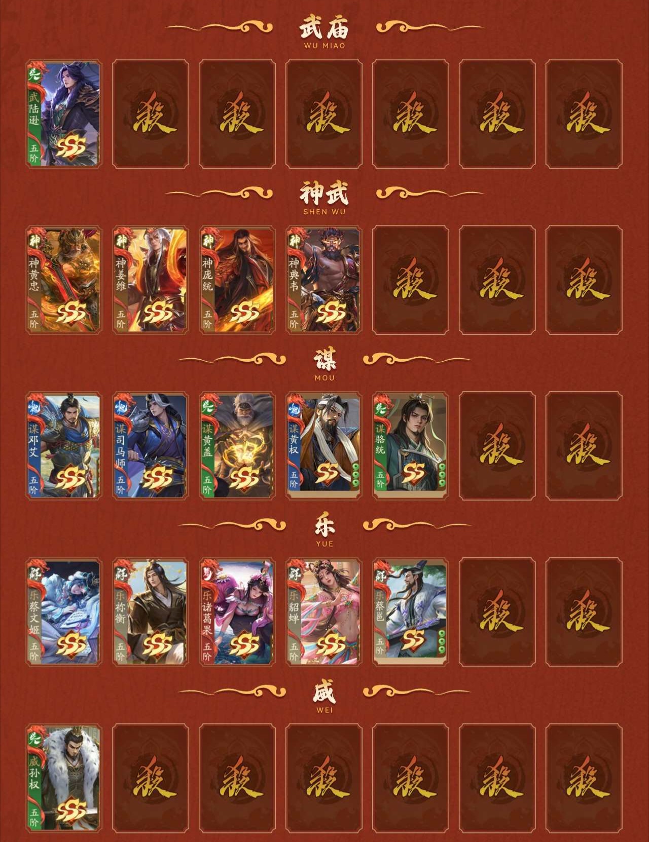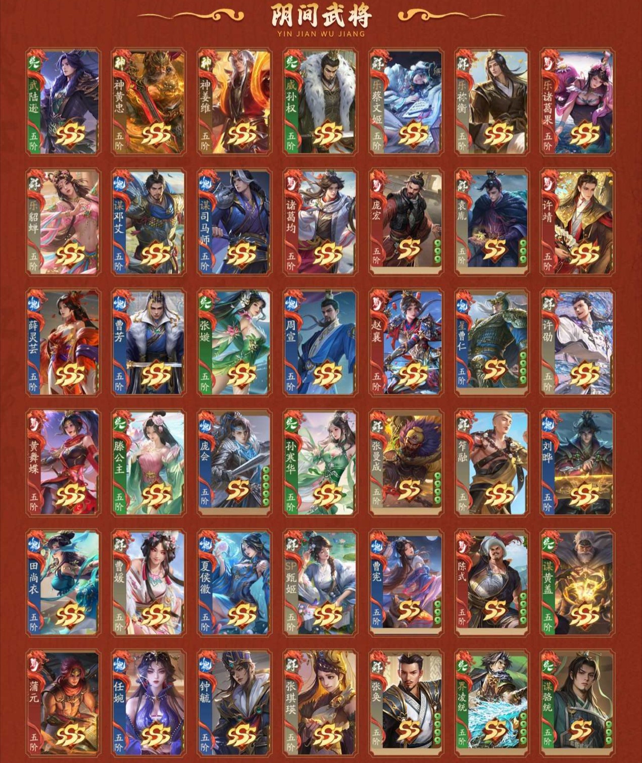 阴间将:武陆逊/神黄忠/神姜维/威孙权/乐蔡文姬/乐祢衡/乐诸葛果/乐貂蝉/谋邓艾/谋司马师/诸葛均/庞宏/袁胤/许靖/薛灵**/曹芳/张嫙/周宣/赵襄/星曹仁/许劭/黄舞蝶/藤公主/庞会/孙寒华/张曼成/笮融/刘晔/田尚衣/曹媛/夏侯徽/SP甄姬/曹宪/陈式/谋黄盖/蒲元/任婉/钟毓/张琪瑛/张奂/界凌统/谋骆统
