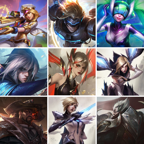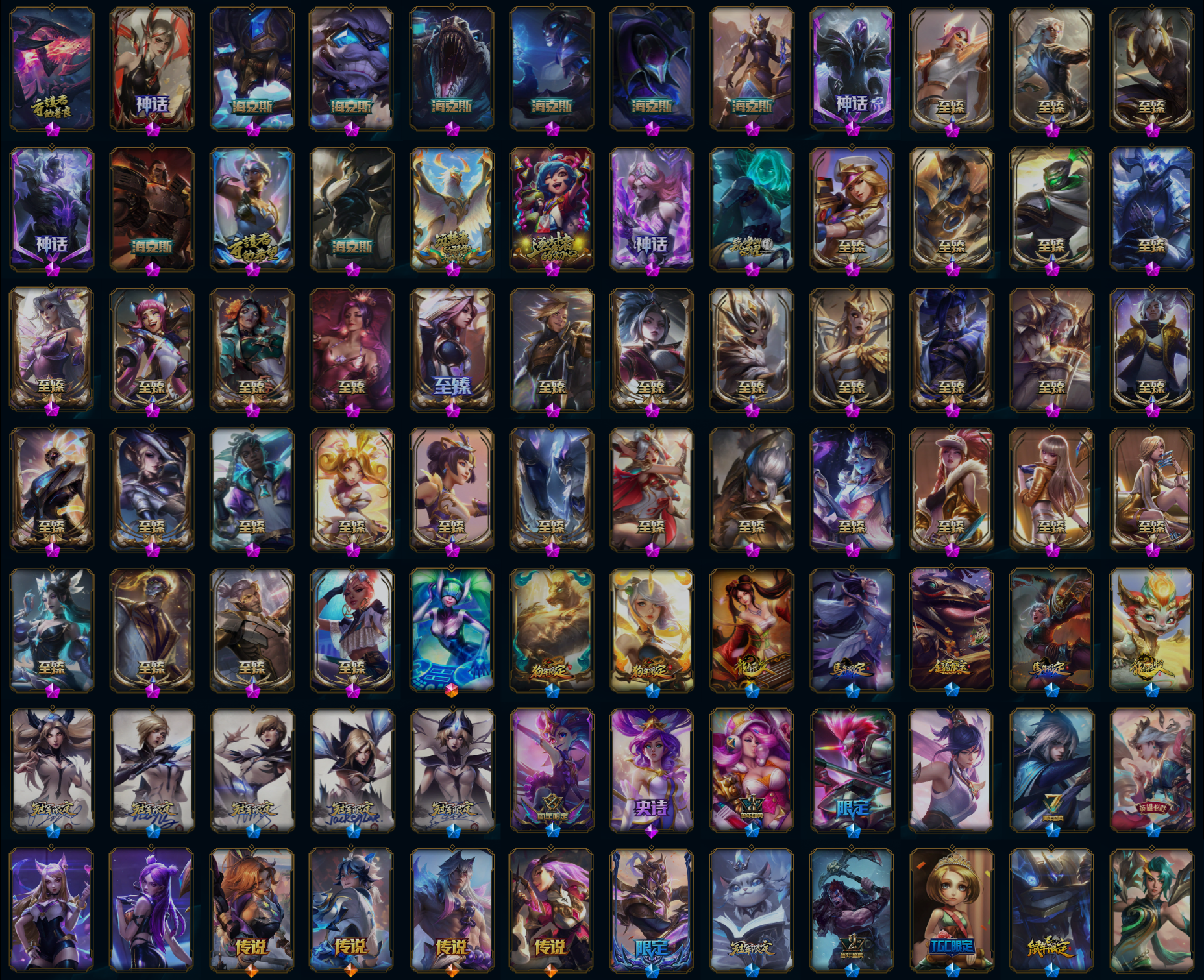 【传说皮肤】幻灵战斗队长厄运小姐 合金巨兽努努和威朗普 灵魂莲华瑟提 青花瓷伊泽瑞尔 邪鸦魅影乐芙兰 神拳李青 源计划超体莫德凯撒 银河魔装机神兰博 驯龙炮手崔丝塔娜 西部天使赛娜 欧米伽小队幽灵特工 至尊魔女莫甘娜 光明哨兵格雷福斯 星之守护者洛 星之守护者金克丝 女帝卡特琳娜 偶像歌手阿狸 耀星女神拉克丝 西部魔影卢锡安 屠龙勇士潘森 蔷薇绅士杰斯 鬼魂新娘莫甘娜 地狱行者孙悟空 暗星尊烬 月蚀骑士蕾欧娜 腥红之月鬼武姬阿卡丽 黑夜使者亚索 钢铁之翼凯尔 女警狙击凯特琳 炼狱魔犬内瑟斯 红色男爵库奇 焰尾妖狐阿狸 陆地王者4WD布里茨 大天使长米迦勒凯尔 神王盖伦 神王德莱厄斯 战地巨兽科加斯 宇航员诺提勒斯 女校长菲奥娜 律政大亨蒙多 泳池派对吉格斯 约德尔国队长提莫 双重冰晶艾尼维亚 霸天零式赛恩 冰霜之刃艾瑞莉娅 黯晶凤凰艾尼维亚 第三类接触黑默丁格 战场女武神凯尔 黎明使者锐雯 未来战士凯特琳 冰霜亚龙希瓦娜 恶魔男爵瑞兹 金牌主播德莱文 灌篮高手德莱厄斯 星之守护者拉克丝 源计划净化薇恩 丧尸布兰德 提莫约德尔人的一大步 电玩女神娑娜 苹果机器人布里茨 女主播迦娜 地狱之门卫士加里奥 黯黑魔龙希瓦娜 暗星锤石 最终BOSS维迦 绅士科加斯 霸天异形卡兹克 死亡骑士盖伦 枯萎之壤泽拉斯 苍穹之光韦鲁斯 铁哥们儿奥拉夫 源计划联合艾希 魔幻卡牌崔斯特 战地机甲厄加特 上古战魂魔腾 女皇艾希 符文战熊沃利贝尔 源计划林易 冰川巨兽墨菲特 烈焰雄心崔丝塔娜 恶魔之刃泰达米尔 钢铁军团盖伦