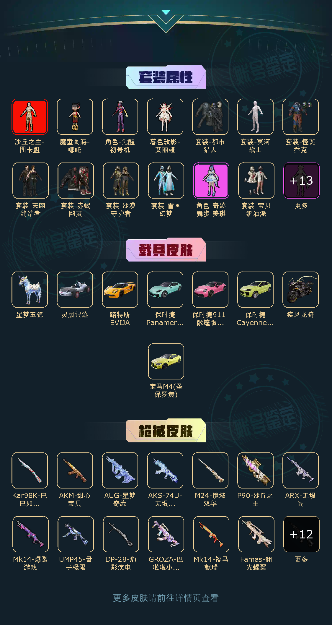 【稀有资产】暮色玫影-艾丽娅[3级]/角色-魔童闹海-哪吒[1级]/沙丘之主-图卡盟[1级]/套装-雪国幻梦/套装-怪诞乔克/M416-暖熊萌萌/AKM-甜心宝贝/AUG-星梦奇缘/M416-墨龙九天/AKS-74U-无垠阁/SCAR-L-魔童闹海 哪吒/SCAR-L-梦幻火箭/角色-8号机/角色-Mark.06/熔岩游骑兵面罩/小丑红鼻头/木乃伊套装/套装-赤蝎幽灵/套装-都市猎人/套装-沙漠守护者/套装-天网终结者/套装-浪漫天命/套装-暗影哥特/套装-龟仙人/套装-迅捷狂鲨/套装-胖达团团/套装-兔兔白日梦/玩偶服-懒羊羊/玩偶服-美羊羊/角色-粉雾星云/角色-琉璃花蕾/角色-冰公主/角色-情公主