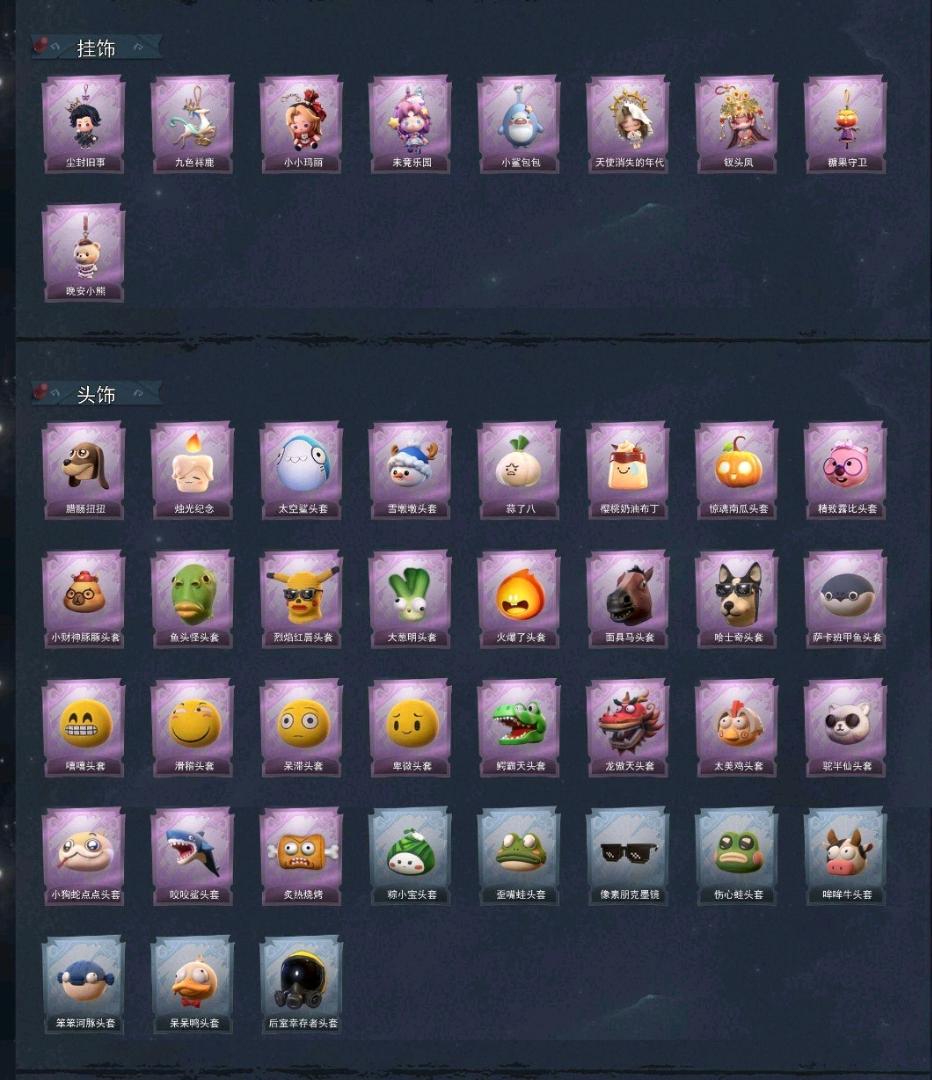 【头饰】腊肠扭扭、烛光纪念、太空鲨头套、雪墩墩头套、蒜了八、樱桃奶油布丁、惊魂南瓜头套、精致露比头套、小财神豚豚头套、鱼头怪头套、烈焰红唇头套、大葱明头套、火爆了头套、面具马头套、哈士奇头套、萨卡班甲鱼头套、嘻嘻头套、滑稽头套、呆滞头套、卑微头套、鳄霸天头套、龙傲天头套、太美鸡头套、驼半仙头套、小狗蛇点点头套、咬咬鲨头套、炙热烧烤、粽小宝头套、歪嘴蛙头套、像素朋克墨镜、伤心蛙头套、哞哞牛头套、笨笨河豚头套、呆呆鸭头套、后室幸存者头套