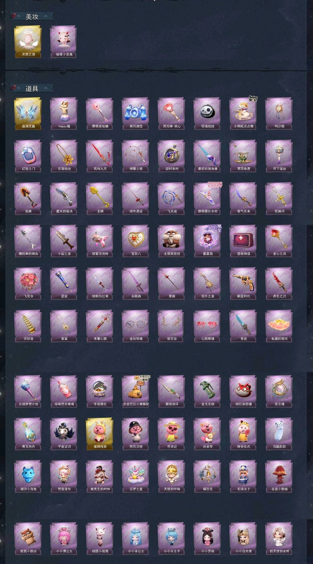 【道具皮肤】喷气背包-晶澜灵翼、音响-happy猫、铲子-赞萌波板糖、喷气背包-乘风溯雪、腰包-惊魂娃娃、长鞭-小狗蛇点点鞭、音响-鸣沙鼓、传送按钮-幻宠之门、摸金符-花落精绝、桃木剑-凤鸣九天、长鞭-缚誓之锁、传送按钮-逆时审判、桃木剑-最后的独角兽、黄牛能量饮料-雪顶奇愿、腰包-月下莲台、铲子-焰骨、短管猎枪-星光的裁决、铲子-龙鳞、桃木剑-绯色遗证、长鞭-飞天绫、短管猎枪-赞萌露比水枪、刺刀-紫气东来、摸金符-祝祷词、铲子-撒拉弗的祷告、刺刀-小鲨匕首、电击枪-甜蜜泡泡枪、腰包-宝剑八、急救包-土拨鼠捏捏、折扇-露露扇、急救包-蔷薇物语、铲子-圣心之泪、额外的背包-飞花令、专业手电-星寂、刺刀-铂刺与红萼、桃木剑-永眠曲、除颤仪-弦外之音、转轮手枪-新星时代、刺刀-赤色之刃、葫芦-伏妖塔、摸金符-紫霄、急救包-末章心跳、夜视仪-金丝眼镜、夜视仪-花容、夜视仪-心跳眼镜、刺刀-青瓷、腰包-私藏的银河、专业手电-云端梦想计划、黄牛能量饮料-珍珠芭乐莓莓、音响-冬夜暖忆、铲子-卡皮巴拉小黄豚铲、刺刀-碧络琅环、闪光弹-金戈玄铜、腰包-绯红柴郡猫、传送按钮-昆仑镜、黄牛能量饮料-青玉抱丹、背饰-子夜证词、背饰-蜜蜂线索、背饰-兜风日程、背饰-寻凉记、背饰-班卓琴、背饰-晚安仪式、背饰-白鼬趴趴、背饰-潮汐小海兔、背饰-梵音莲华、背饰-兔先生的时钟、背饰-云梦之星、背饰-天使的呼唤、背饰-蝶恋花、背饰-毛球夹子、背饰-在逃小新娘、背饰-鼠鼠小跟班、背饰-炽天使的余烬