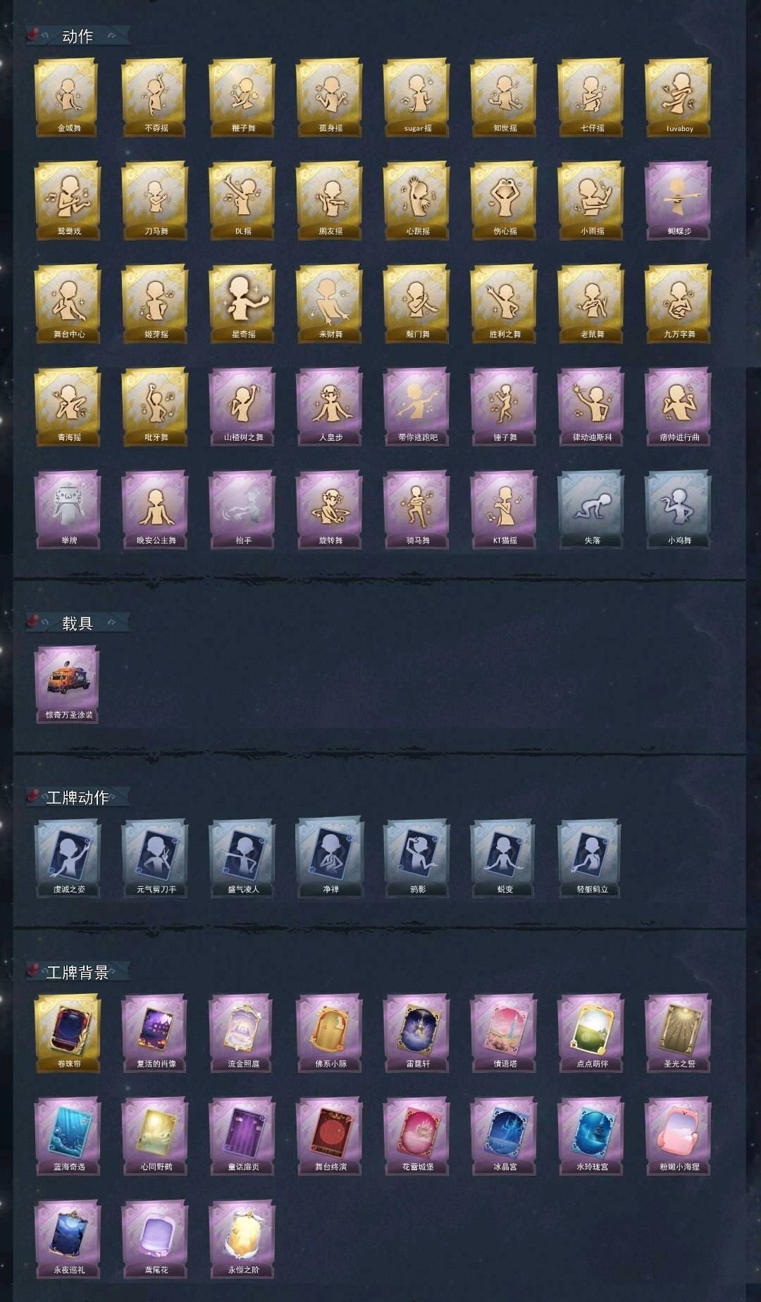 【动作】金城舞、不孬摇、鞭子舞、孤身摇、sugar摇、知世摇、七仔摇、luvaboy、鸳鸯戏、刀马舞、DL摇、鹏友摇、心跳摇、伤心摇、小雨摇、蝴蝶步、舞台中心、姬芽摇、星奇摇、来财舞、敲门舞、胜利之舞、老鼠舞、九万字舞、青海摇、吡牙舞、山楂树之舞、人皇步、带你逃跑吧、锤子舞、律动迪斯科、痞帅进行曲、举牌、晚安公主舞、抬手、旋转舞、骑马舞、KT猫摇、失落、小鸡舞