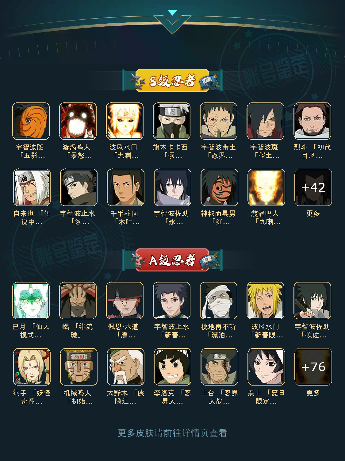 仙人自来也 纲手 波风水门 百战水门 猿飞日斩 千手柱间 宇智波斑 宇智波鼬 舞之自来也 大蛇丸 百战大蛇 秽土四代 秽土三代 秽土长门 仙人兜 黄猿九喇嘛鸣人 紫狗永恒佐助 樱婊忍战樱 秽土鼬 普通自来也 百豪纲手 死门凯 二代扉间 秽土二代 秽土初代 秽土柱间 白面具 须佐卡卡西 小胡子鬼灯幻月 雷影 土影 无 佩恩 百战佩恩 青年柱间 创立初代 秽土斑 青年斑 解斑 须佐止水 虎皮 破面带土 红夜带土 罗砂 秽土三代风影 忍战雷影 三代雷影 金角银角 秽土半藏 忍战大野木 小土豆 天道超 大筒木桃式 大筒木金式 钢铁之躯凯 桀骜之刃阿斯玛 狂野之鲨鬼鲛 飞段 黑飞段 百豪樱 忍战李 大卡卡西 五代水影照美冥 宇智波鼬 仙鸣 九尾查克拉鸣人 鹰佐 奇拉比 青年艾 半蛇兜 晓蛇 新春鼬 面麻 须佐佐助 疾风咒印佐助 忍战宁次 忍战天天 最终章雏田 幻容卡卡西 神卡 忍战卡卡西 泳装卡卡西 忍战凯 青春哥 惊门凯 爱情哥 新春止水 新春水门 青年水门 青水 新春我爱罗 泳装照美冥 侠隐照美冥 侠隐纲手 侠隐兜 漂泊再不斩 漂泊佩恩 漂泊二代 漂泊小南 漂泊佩恩 三船 青年三船 青年长门 泳装南 新春南 黑绝 新春大蛇丸 晓创生角度 晓创生蝎 晓创生飞段 泳装鼬 鲛肌融合鬼鲛 新春迪达拉 秽土迪达拉 恶灵之影飞段 暴怒带土 忍战黄土 卑留呼 桃博 黑土