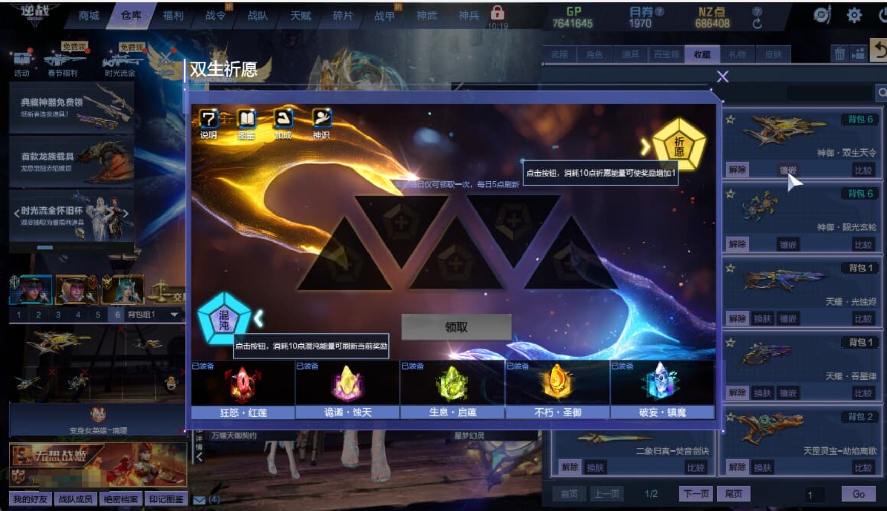 5转武装满神武,秘境卡牌已经刷好了。满沉淀号,卡牌如果到期自己仓库里重新聚变下即可,不朽神躯智澜+不朽神躯驭电 聚变。
