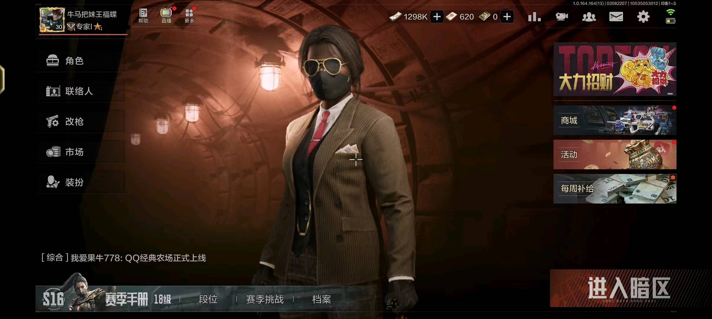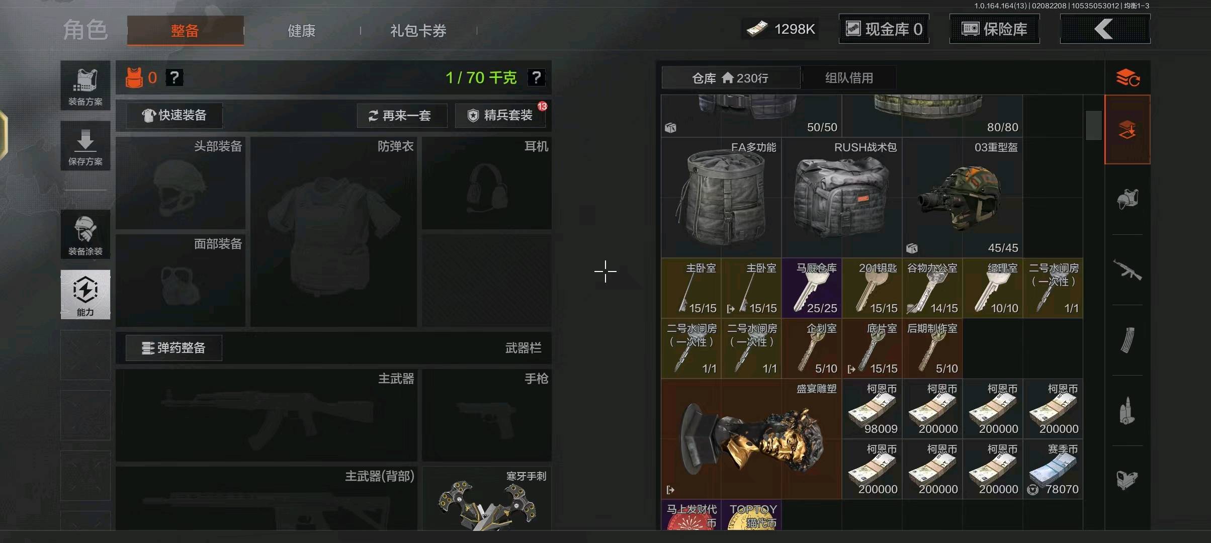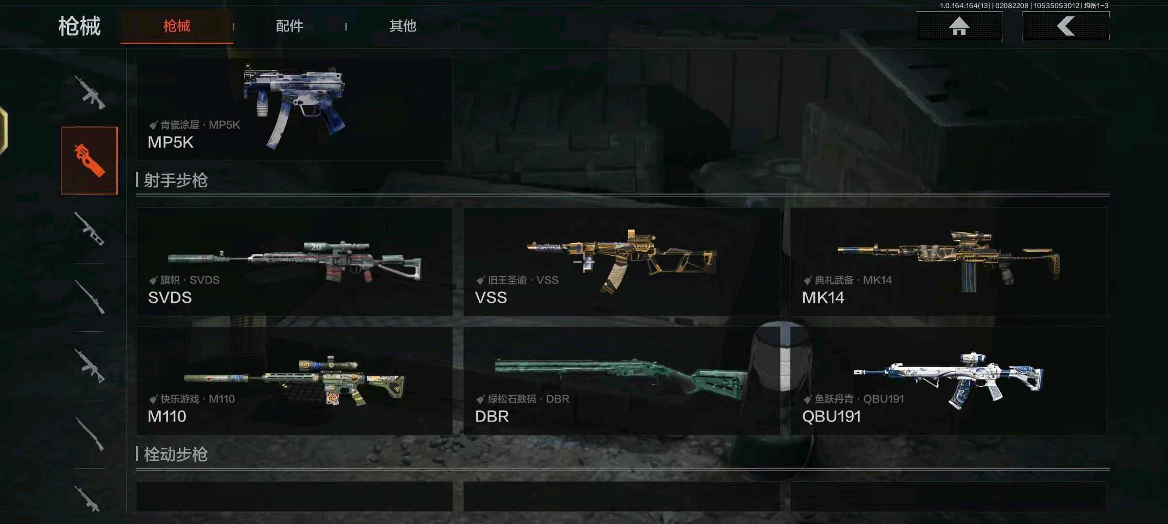 仓库5m存款120万仓库有一个t加一个大金,有aek和mpx和qbz191和vss的金皮,还有寒牙手刺和多斯拐杖还有一件多斯主套
