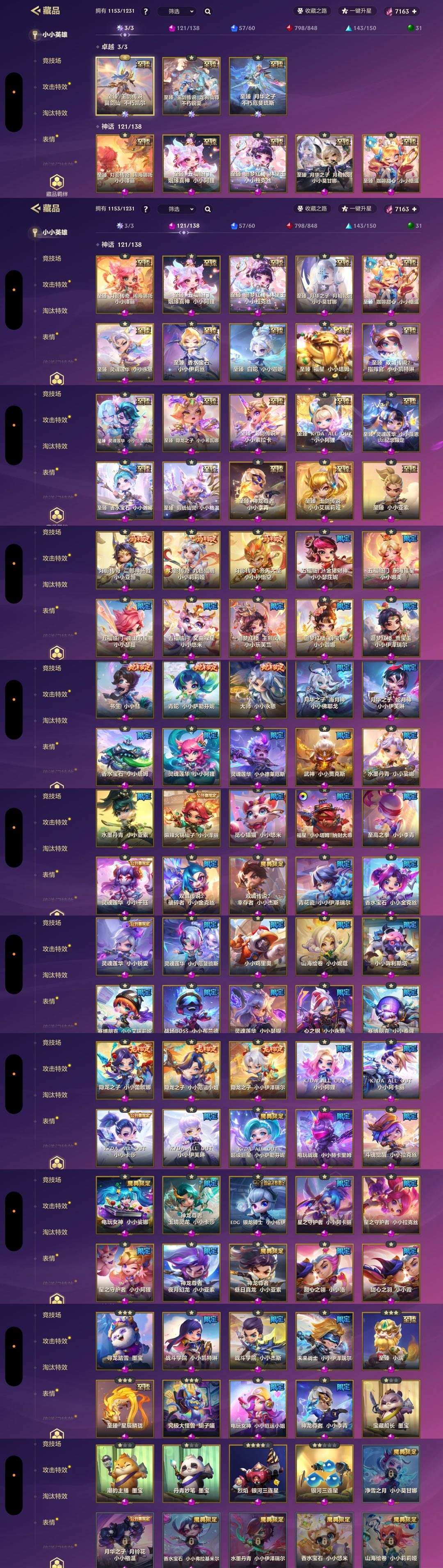 战斗学院 小小杰斯✅未来战士 小小伊泽瑞尔✅至臻 小瑞✅究极大怪兽 胡子喵✅神龙尊者 小小季青✅烈焰 银河二连星✅银河三连星✅kda阿卡丽✅kda伊芙琳✅斗魂觉醒拉克丝✅电玩人马✅电玩火男✅✅
