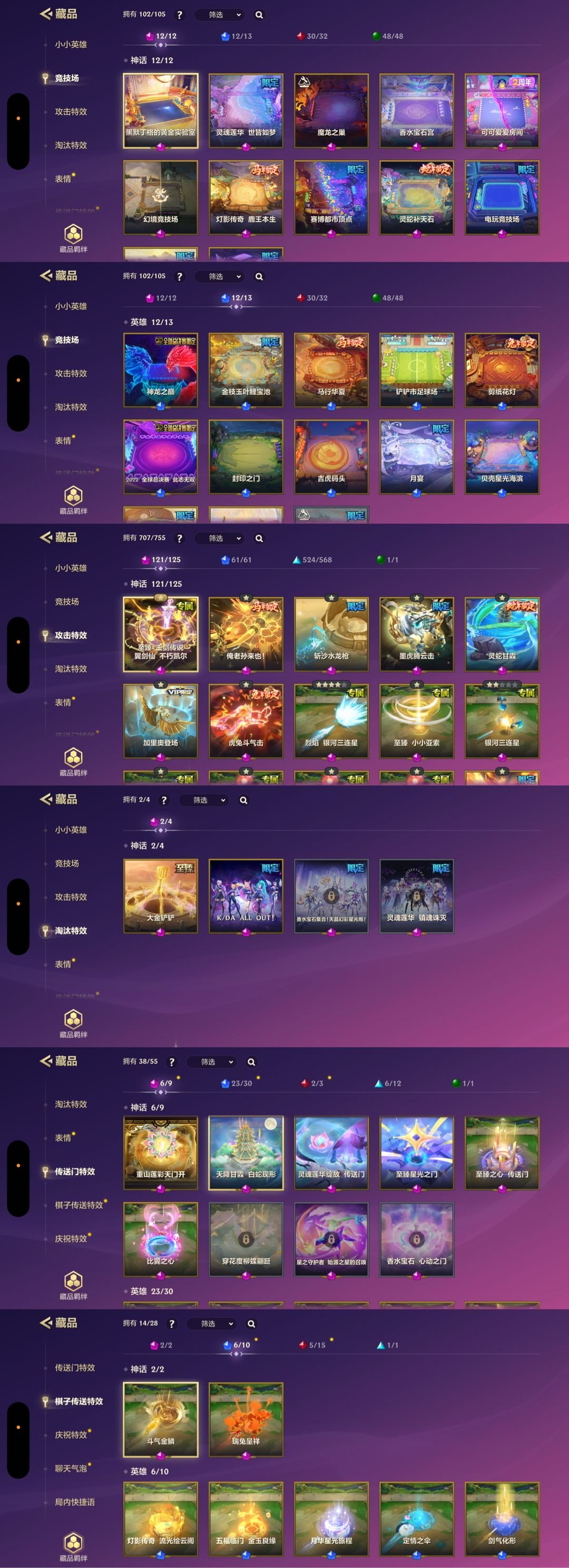 黑默丁格的黄金实验室✅魔龙之巢✅电玩竞技场✅香水宝石宫✅神龙之巅✅铲铲市足球场✅剪纸花灯✅灵蛇补天石✅KDA强音之巅舞台✅大家一起包饺子 竞技场✅无极剑境✅吉虎