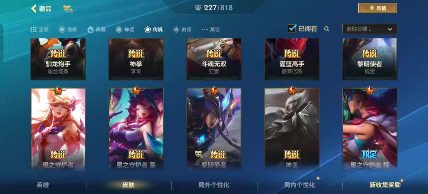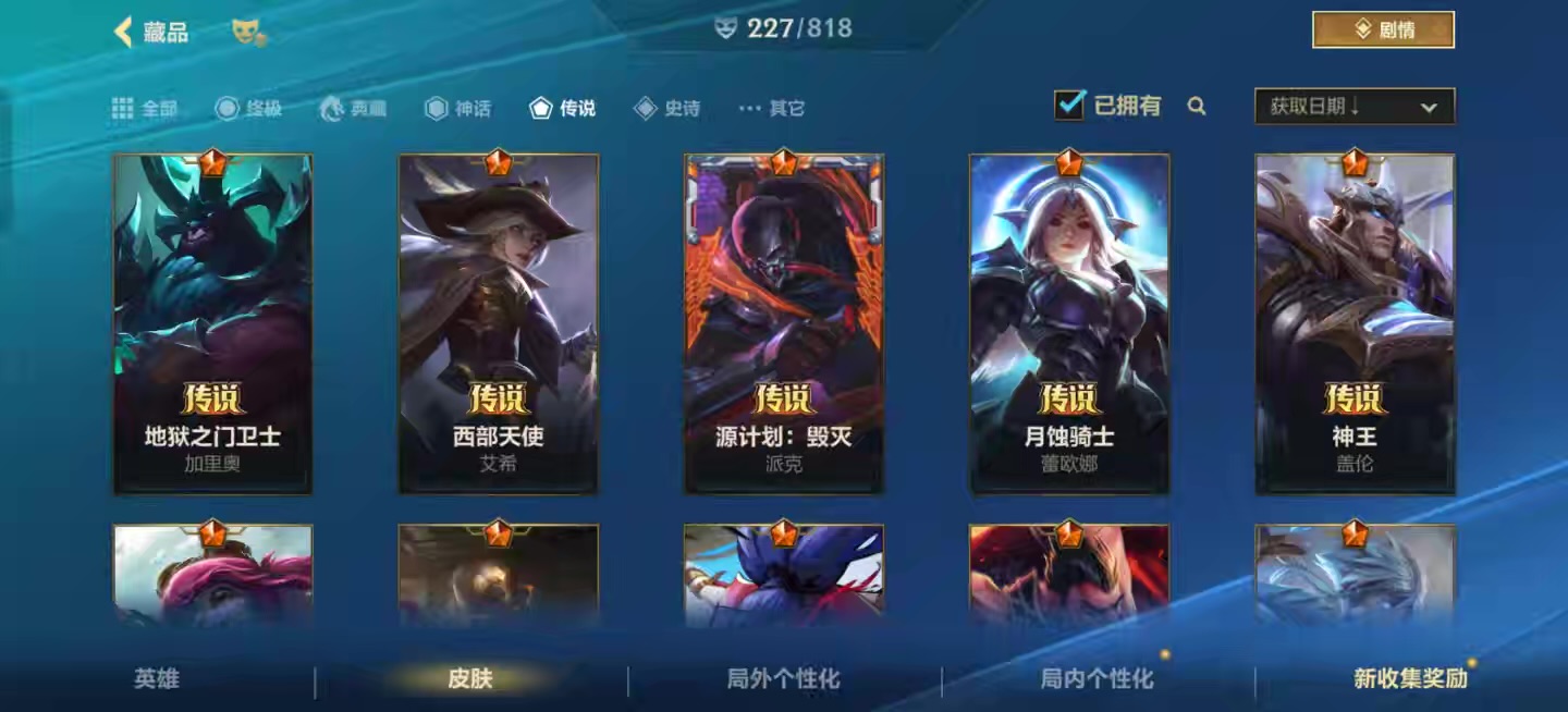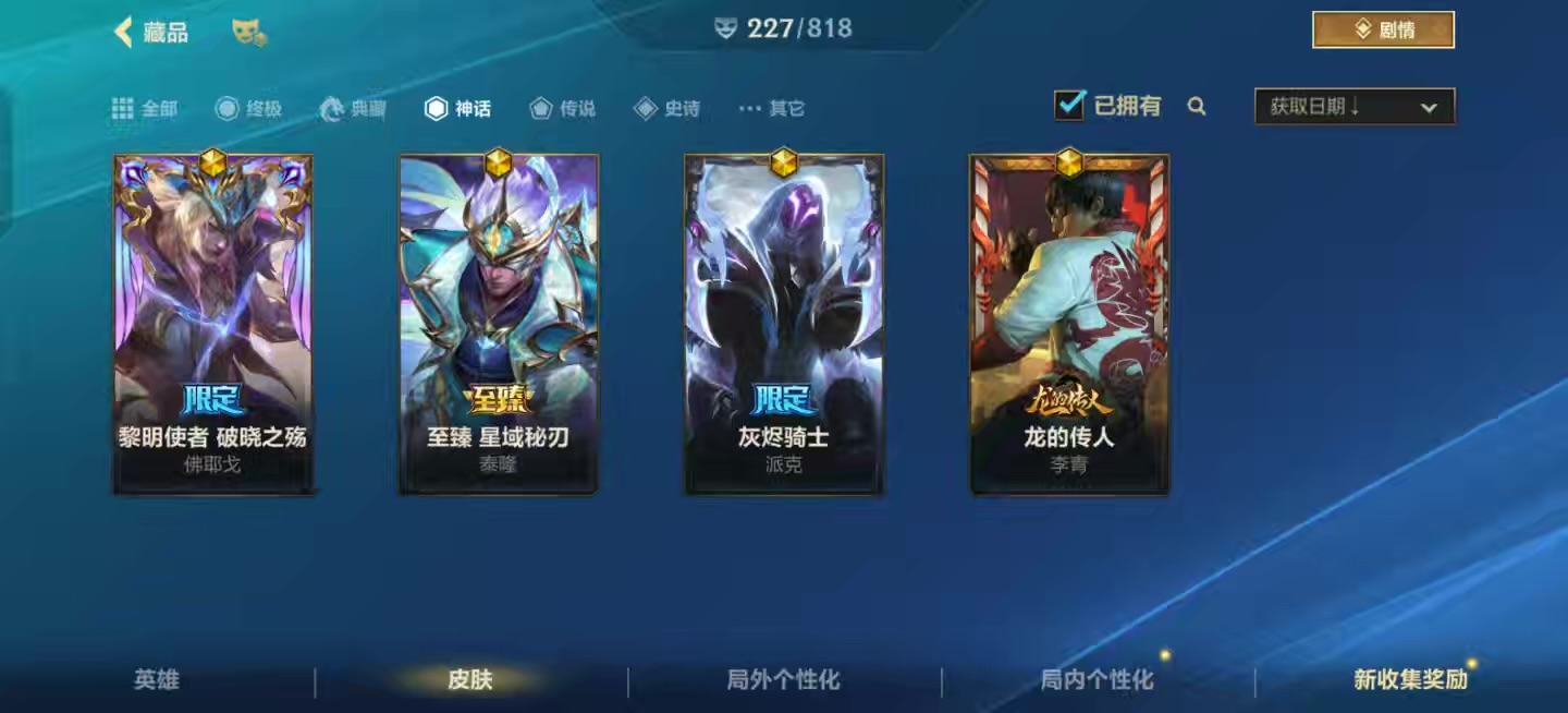【安卓】 到时不下)227皮肤4神话(派克灰烬骑士,佛耶戈光明使者,男刀星域秘刃),19传说,107史诗