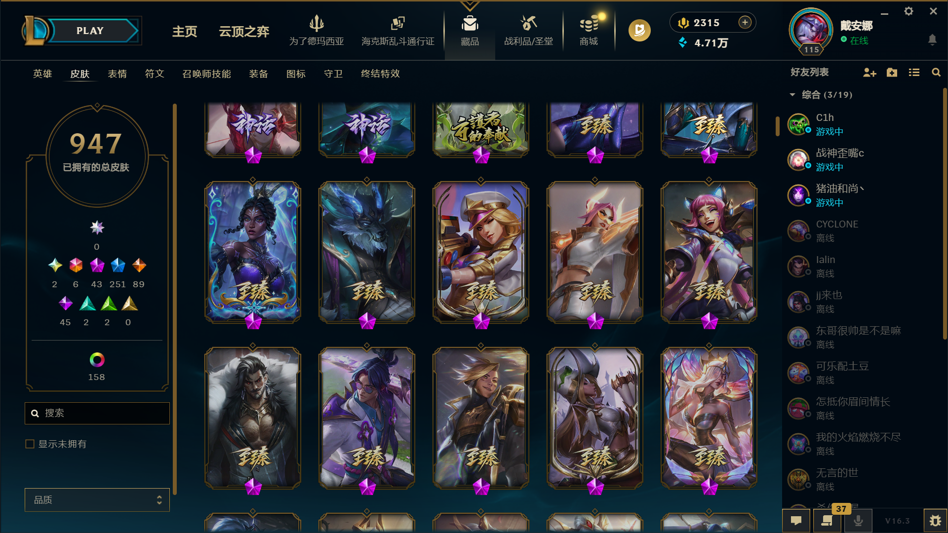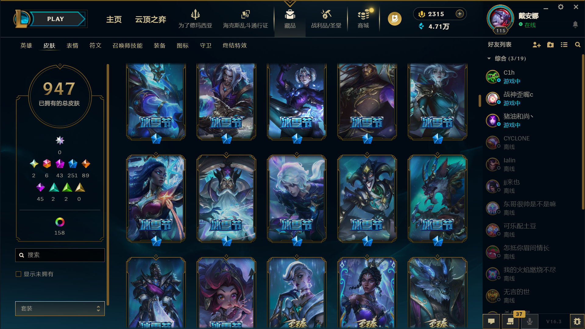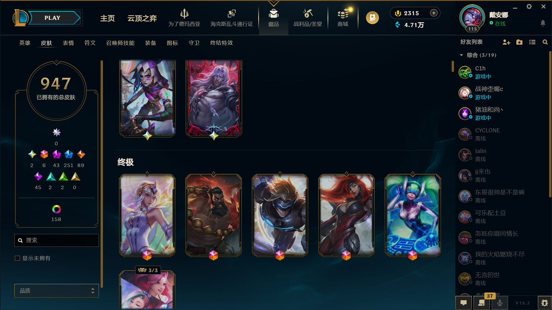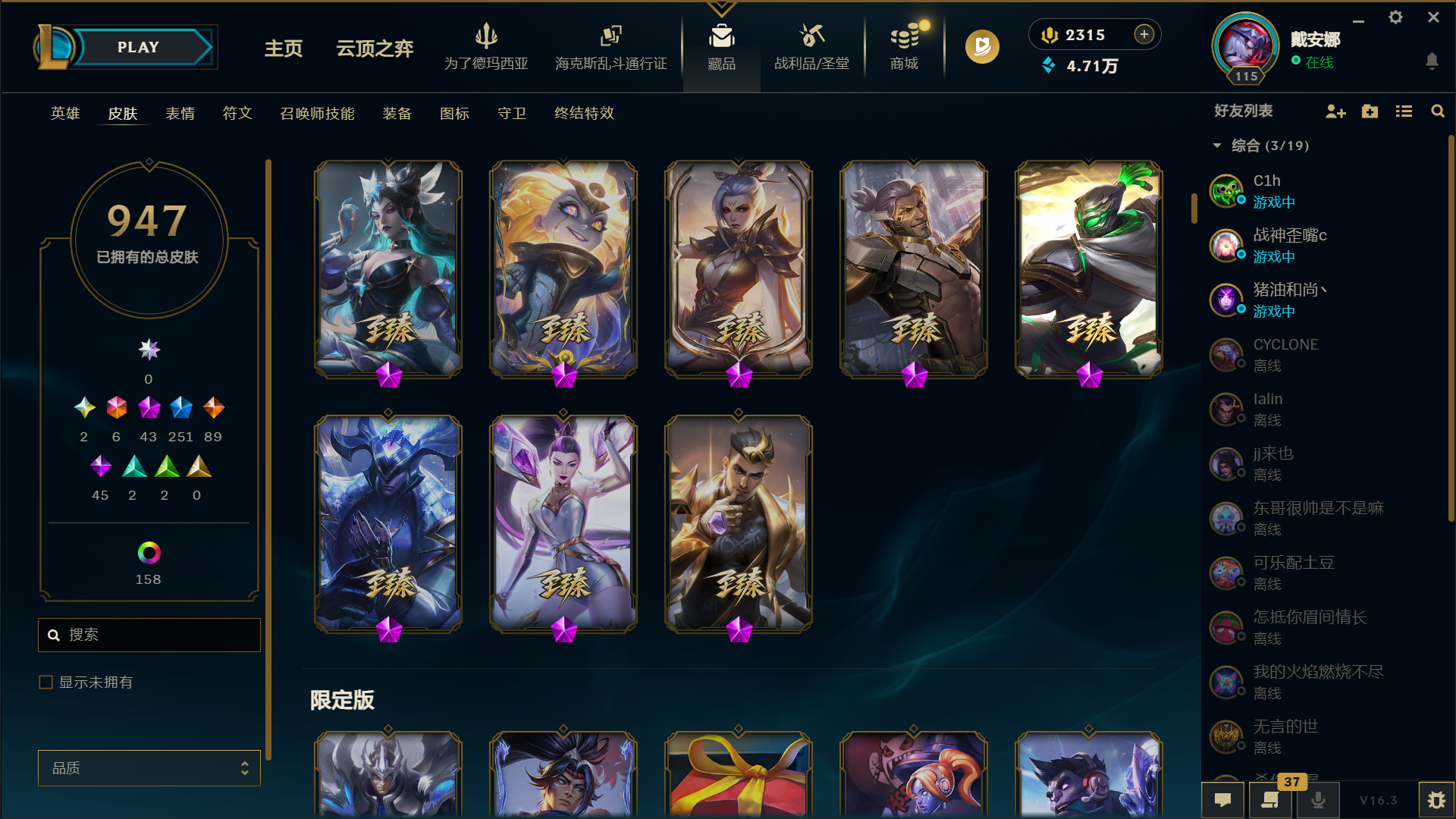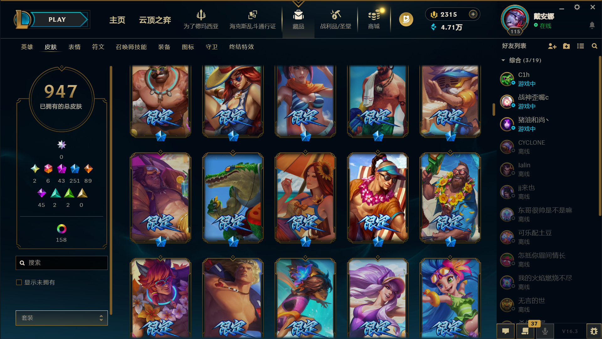 神堂佛爷 金克斯 龙虾带炫彩 总皮肤947,限定251,传说89,终极6,炫彩158,至臻30 ID编号#5555