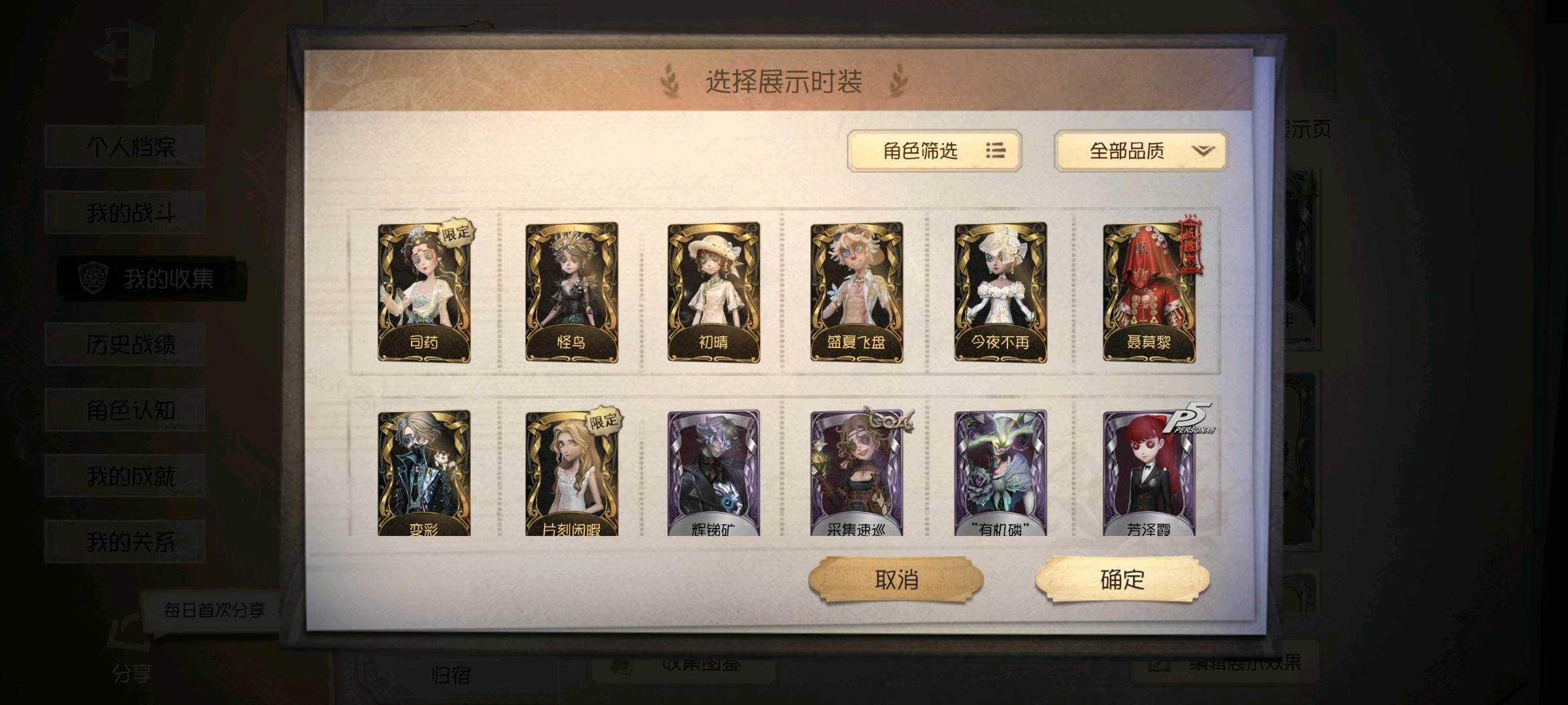 【安卓】 P5全皮,石榴和恶之源,调香师新金皮,初晴,典狱长,白泽套,怪鸟,惊鸿套,共潮生,欧律,试运者,